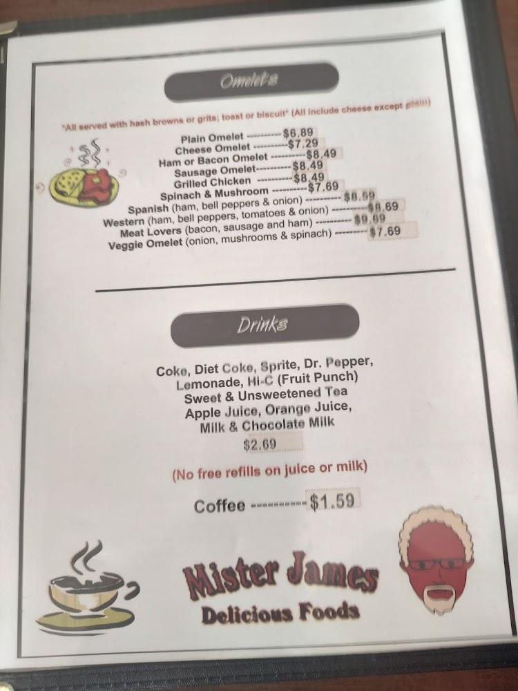The menu at Mister James showcases a range of breakfast and brunch dishes. Notable items include their famous chicken and waffles and fluffy pancakes. Expect hearty options like biscuit and gravy, which guests adore. Smaller portions cater to those on the go, while the children's menu provides simple yet delicious choices. The restaurant also emphasizes local ingredients, ensuring fresh flavors while capturing the essence of home-style cooking. Overall, choices cater to various tastes, making it a versatile dining spot.